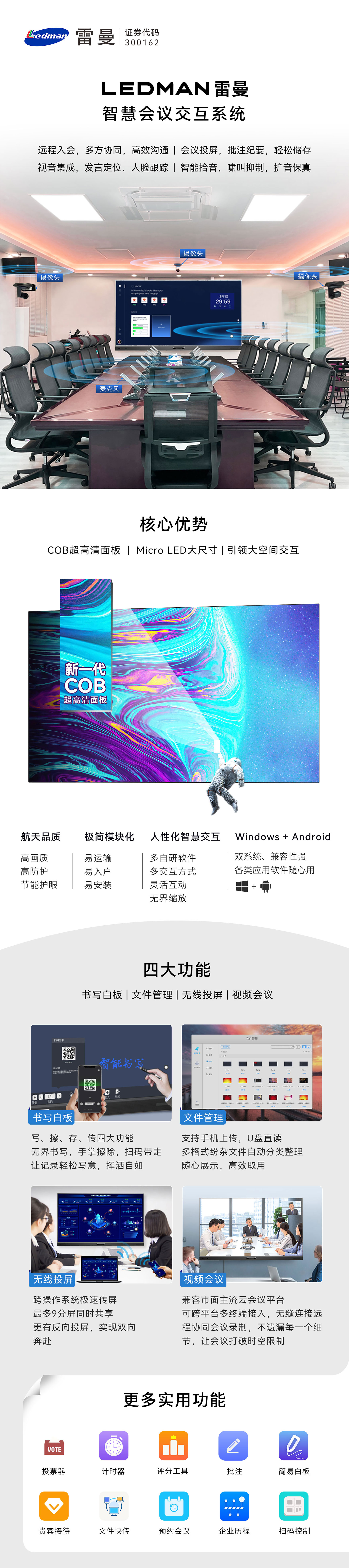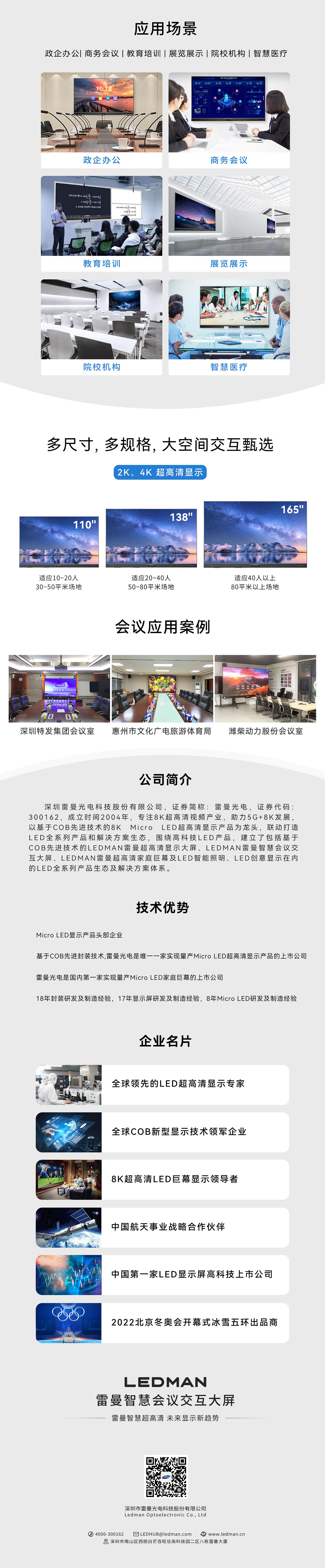 深圳雷曼光電科技股份有限公司(證券簡稱:雷曼光電,證券代碼:300162)成立于2004年,是全球領先的LED超高清顯示專家,全球COB新型顯示技術領軍企業,8K超高清LED巨幕顯示領導者,中國第一家LED顯示屏高科技上市公司,中國航天事業戰略合作伙伴,2022北京冬奧會開幕式冰雪五環出品商。雷曼專注于8K超高清視頻產業,助力5G+8K發展,以基于 COB 先進技術的8K Micro LED超高清顯示產品為龍頭,聯動打造LED全系列產品和解決方案生態。按品牌計,雷曼2021年至2023年度在LED小間距COB顯示市場市占率位居第一,并獲評國家級制造業單項冠軍。