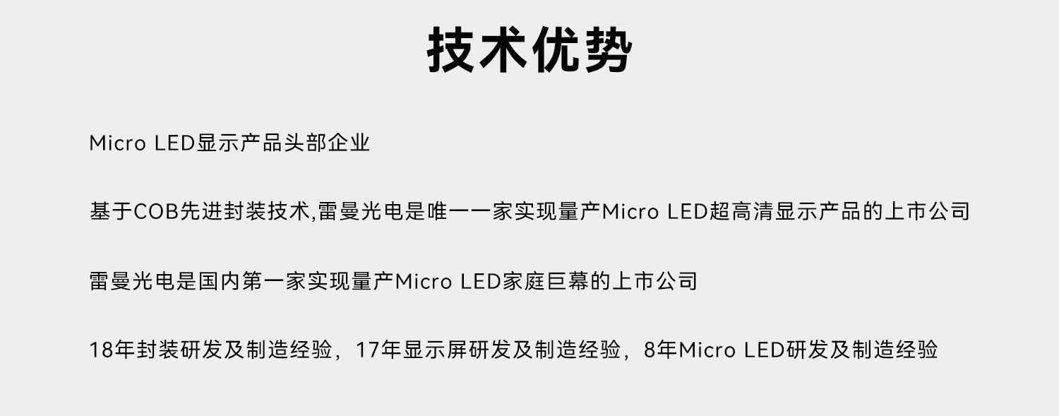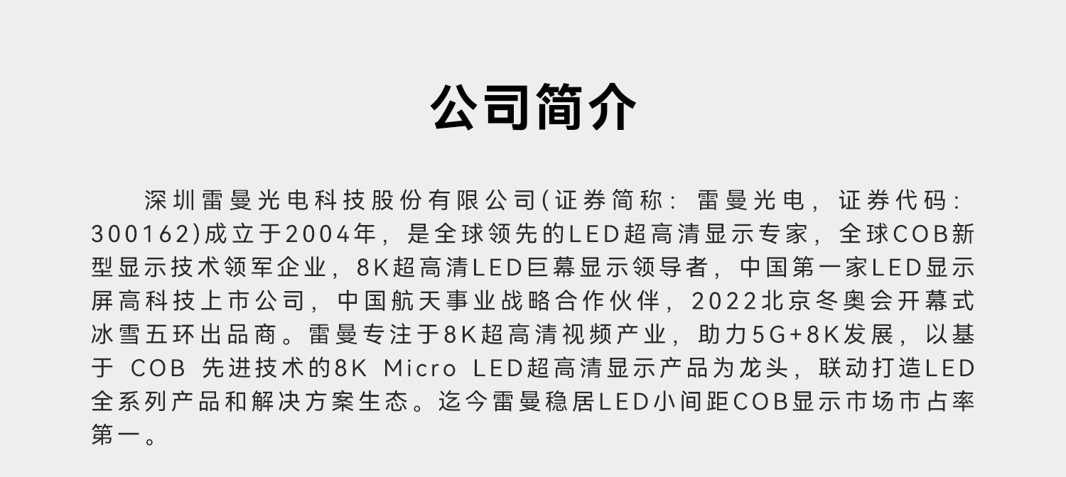 深圳雷曼光電科技股份有限公司(證券簡稱:雷曼光電,證券代碼:300162)成立于2004年,是全球領先的LED超高清顯示專家,全球COB新型顯示技術領軍企業,8K超高清LED巨幕顯示領導者,中國第一家LED顯示屏高科技上市公司,中國航天事業戰略合作伙伴,2022北京冬奧會開幕式冰雪五環出品商。雷曼專注于8K超高清視頻產業,助力5G+8K發展,以基于 COB 先進技術的8K Micro LED超高清顯示產品為龍頭,聯動打造LED全系列產品和解決方案生態。按品牌計,雷曼2021年至2023年度在LED小間距COB顯示市場市占率位居第一,并獲評國家級制造業單項冠軍。