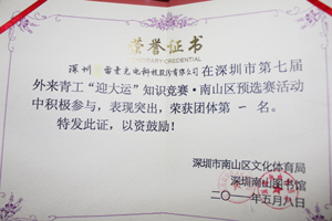 雷曼光電勇奪深圳市第七屆外來青工“迎大運(yùn)”知識(shí)競賽?南山區(qū)預(yù)選賽第一名