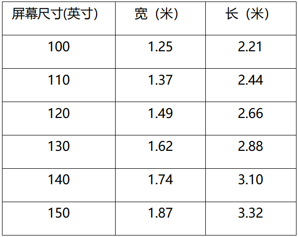 液晶顯示技術(shù),100英寸以上電視的另外一個(gè)問(wèn)題是運(yùn)輸、入戶(hù)困難。下表是100英寸到150英寸電視的長(zhǎng)寬尺寸。