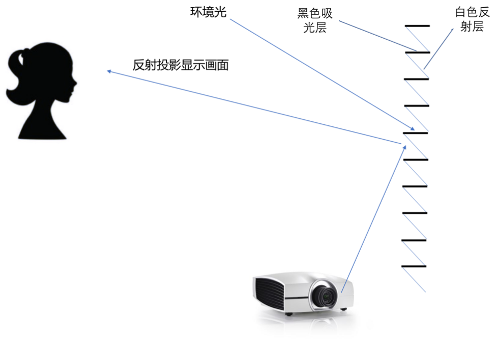 激光投影抗光幕示意圖如圖所示,抗光幕微結(jié)構(gòu)為鋸齒狀的光學(xué)結(jié)構(gòu),鋸齒結(jié)構(gòu)上方為涂覆黑色材料的吸光層,下方為涂覆特殊材料的白色反光層。黑色層可以吸收環(huán)境光,提高對(duì)比度,白色反光層用于投影時(shí)反射圖像。從抗光幕的微結(jié)構(gòu)可以發(fā)現(xiàn),幕布無(wú)法實(shí)現(xiàn)全部黑色,還有相當(dāng)一部分白色,導(dǎo)致幕布的對(duì)比度不高,無(wú)法實(shí)現(xiàn)高品質(zhì)的畫(huà)面顯示。