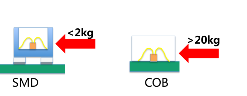 從失效機(jī)理上看,1010小間距常見(jiàn)的不亮現(xiàn)象,其原因有可能是外封膠與支架剝離或者外力撞擊導(dǎo)致金線斷開(kāi)。為此,我們通過(guò)失效分析找出了失效原因,從而針對(duì)膠水密封性或者膠水力學(xué)性能進(jìn)行進(jìn)一步設(shè)計(jì)。同時(shí),我們的COB技術(shù)取消了SMD的支架與SMT回流焊環(huán)節(jié),無(wú)虛焊風(fēng)險(xiǎn),可靠性更高。在推力測(cè)試中,雷曼COB承受推力是SMD燈至少10倍以上,燈珠防撞能力更強(qiáng)。