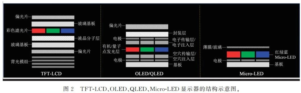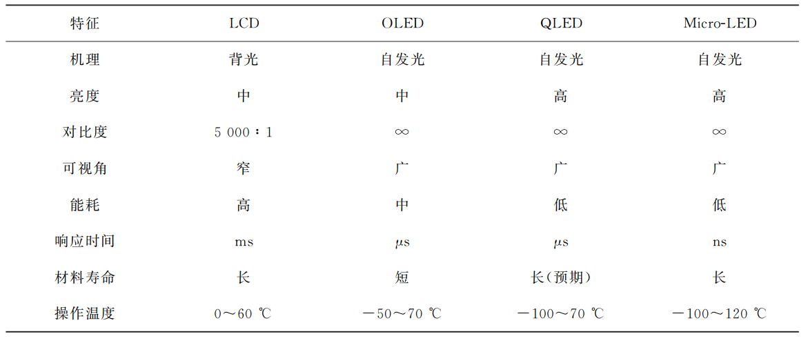 LCD、OLED、QLED和Micro-LED顯示器的結(jié)構(gòu)如圖2所示。從圖中可以看出,Micro-LED顯示器結(jié)構(gòu)簡(jiǎn)單,有效降低了光在顯示器內(nèi)部的損失,減小了顯示器的厚度,更加便于顯示屏的集成。通過(guò)表1可以發(fā)現(xiàn),相比于其他的自發(fā)光技術(shù),從表現(xiàn)出的性能看,Micro-LED顯示具有如下顯著優(yōu)勢(shì):