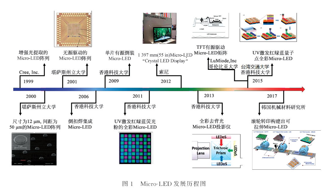 Micro-LED顯示技術(shù)是繼藍(lán)光GaN材料和白光LED照明之后LED領(lǐng)域的最重要進(jìn)展之一。圖1簡(jiǎn)單回顧了Micro-LED的發(fā)展歷程,從中可以發(fā)現(xiàn)這一領(lǐng)域重要進(jìn)展都是來(lái)自于集成工藝的突破。可以預(yù)期,未來(lái)Micro-LED顯示的發(fā)展仍將朝著微縮化、集成化、陣列轉(zhuǎn)移化和全彩化進(jìn)一步發(fā)展。