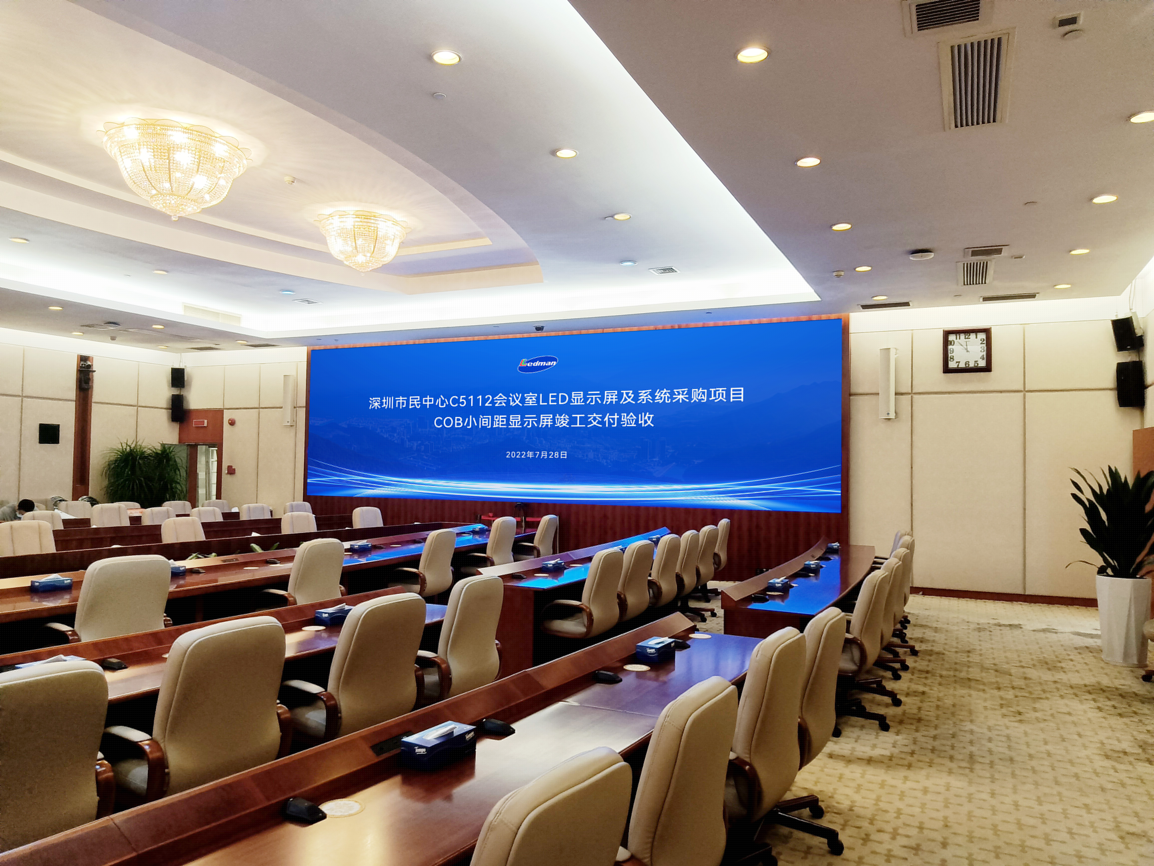深圳市政府C5112會議室是深圳市政府召開全市性重要會議、重大活動的重要場所,對顯示設備的保密性和穩定性有著極高的要求。雷曼超高清大屏采用雙電源、雙信號配置,同時建立冗余備份以增加系統的可靠性。但要在短時間內完成雙備份系統的調試極具挑戰性。