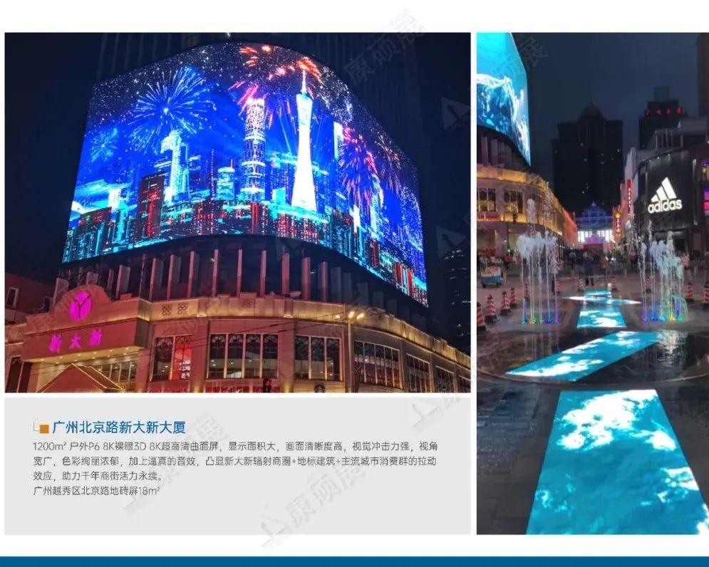 廣州北京路新大新大廈1200㎡8K超高清裸眼3D曲面屏,顯示面積大,畫面清晰度高,視覺沖擊力強,視角寬廣,色彩絢麗濃郁,加上逼真的音效,凸顯新大新輻射商圈+地標建筑+主流城市消費群的拉動效應,助力千年商街活力永續。