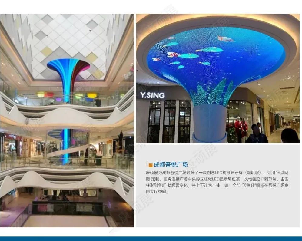 雷曼康碩展為成都吾悅廣場設計了創意LED樹形顯示屏(喇叭屏),采用P6點間距定制,圍繞連接廣場中央的立柱做LED顯示屏包裹,從地面延伸到頂端,由圓柱形到魚缸狀緩緩變化,將上下連為一體,如一個“斗形魚缸”鑲嵌在吾悅廣場室內大廳中間。