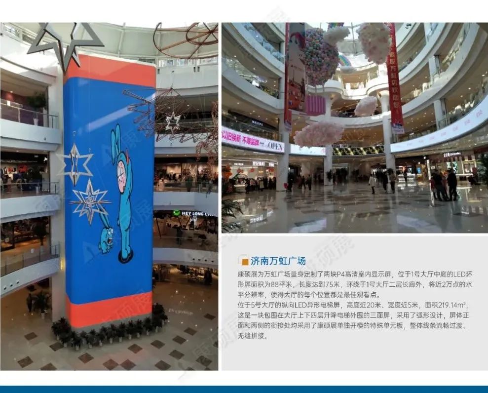 雷曼康碩展為濟南萬虹廣場量身定制了兩塊P4高清室內顯示屏,1號大廳中庭的LED環形屏面積為88平米,長度達75米,水平分辨率將近2萬點,環繞于1號大廳二層長廊外,使得大廳的每個位置都是最佳觀看點。5號大廳的縱向LED異形電梯屏采用了弧形設計,屏體正面和兩側的銜接處均采用了康碩展異形設計,高度近20米、寬度近5米,面積達219.14m2,三面屏將大廳上下四層升降電梯包圍。康碩展定制的LED顯示屏整體線條流暢過渡、無縫拼接,外觀創意十足,為萬虹廣場增添了獨特的魅力,讓購物充滿多重樂趣,成為萬虹廣場一道亮麗的風景線。