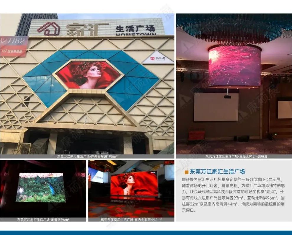 雷曼康碩展為東莞萬江家匯生活廣場量身定制了總面積達366 m2的創意LED顯示屏,隨著商場的開門迎客,精彩亮相,為家匯廣場增添獨特的魅力。LED異形屏以高科技手段打造商場的視覺“亮點”,兩塊97m2的六邊形戶外顯示屏、96m2的互動地磚屏、32m2的圓柱屏以及44m2的室內高清屏,均成為商場眩目的展示窗口。
