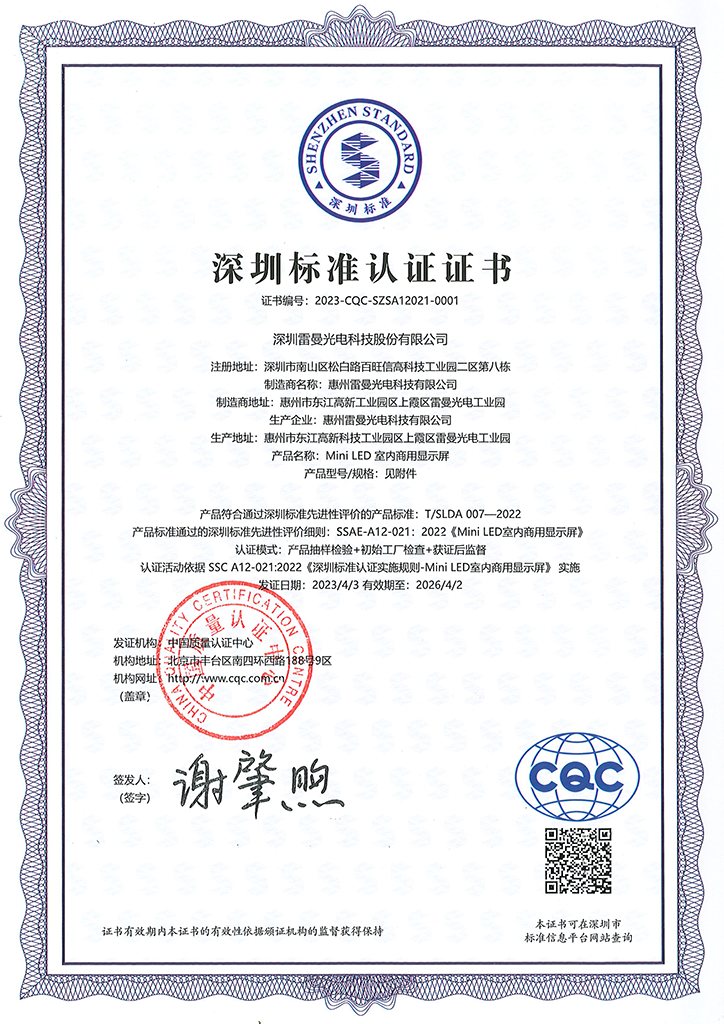 深圳市正在大力培育發展智能終端產業和超高清視頻顯示產業集群,而標準化工作對推動超高清視頻顯示產業高質量發展具有非常重要的戰略意義。雷曼超高清顯示系列產品色彩細膩,畫面表現能力更佳,在色域重合度、灰度等級、刷新頻率、亮度視角、墨色一致性等方面均達到了嚴格的先進性指標。雷曼獲得“深圳標準認證”,是對雷曼嚴于國家行業標準、具備卓越品質的超高清顯示系列產品的權威認證。
