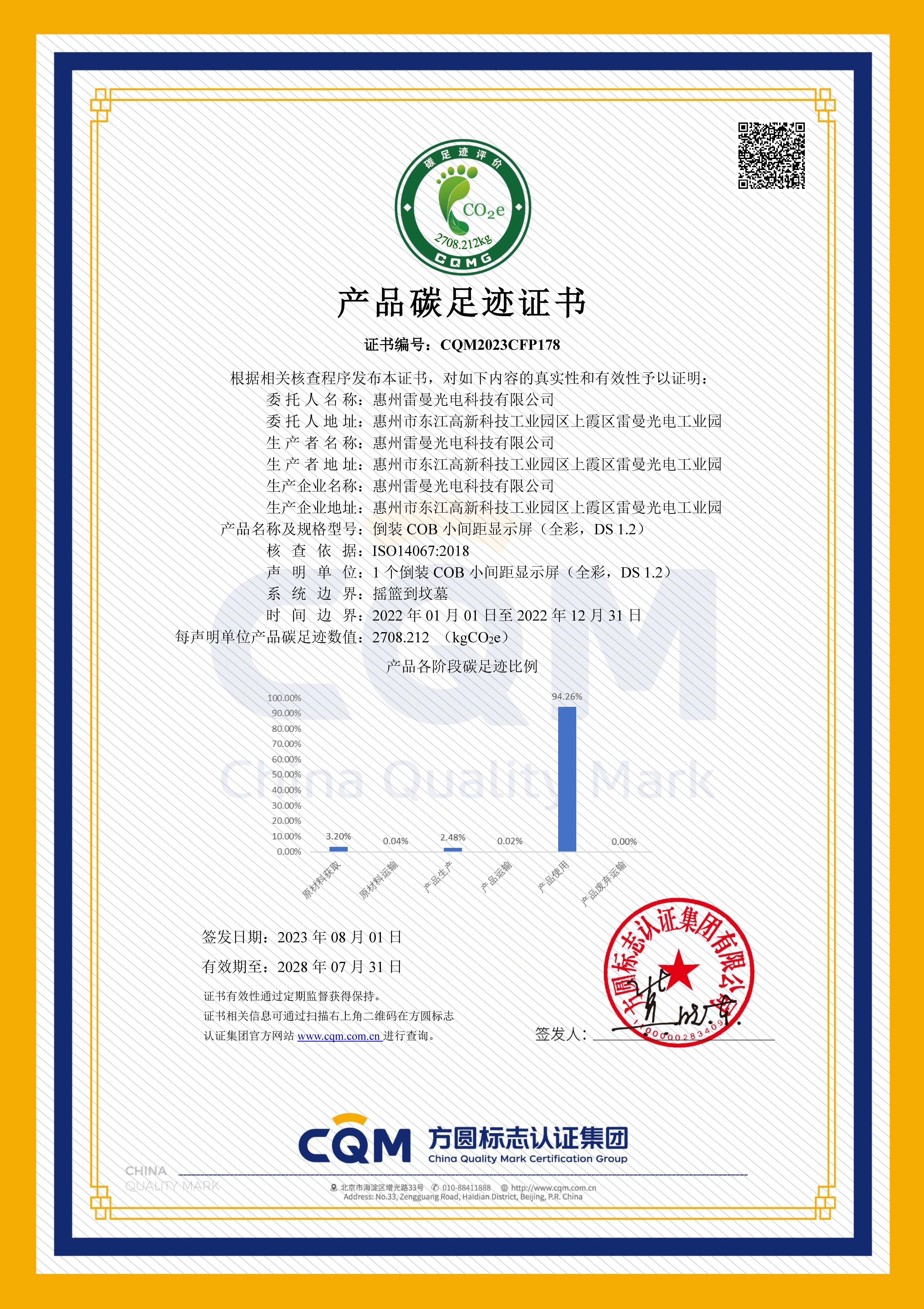 為積極響應(yīng)國家雙碳戰(zhàn)略目標(biāo),充分踐行綠色低碳的可持續(xù)發(fā)展理念與綠色制造發(fā)展工作,惠州雷曼光電科技有限公司已在2023年8月份獲得《產(chǎn)品碳足跡證書》,同時,惠州雷曼持續(xù)對溫室氣體排放情況進行監(jiān)控,由第三方評價機構(gòu)出具2024年度的《產(chǎn)品碳足跡評價報告》、《溫室氣體核查報告》、《產(chǎn)品生命周期評價報告》。
